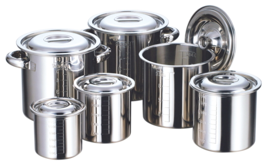 | 品番 | 規格 | 本体 内寸(㎜) | 底平面径(㎜) | 板厚(㎜) | 製品重量(g) | 満水容量(ℓ) | 目盛表示 | 取手 |